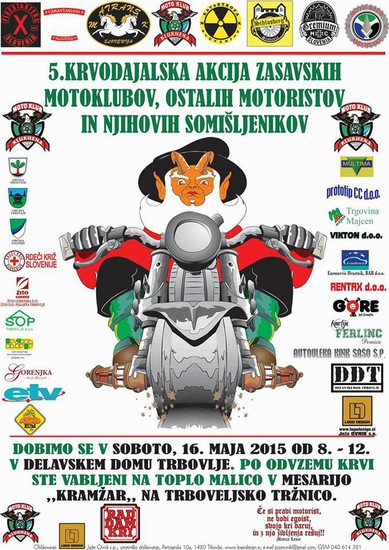 V soboto, 16. maja so motoristi zasavskih moto klubov že petič prišli na krvodajalsko akcijo motoristov. V sklopu omenjene krvodajalske akcije so lahko zainteresirani prejeli vse potrebne informacije in imeli možnost podpisa pristopnih izjav na predstavitveni stojnici RKS OZ Trbovlje na temo darovanja organov.