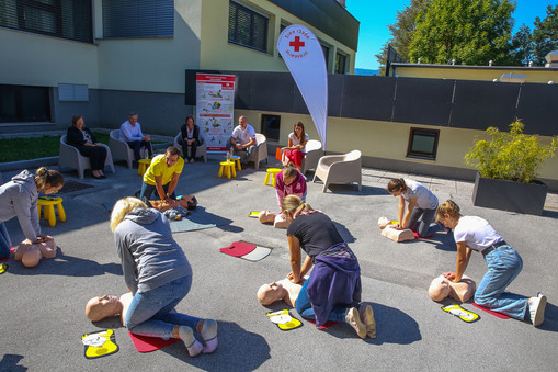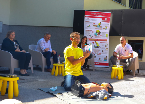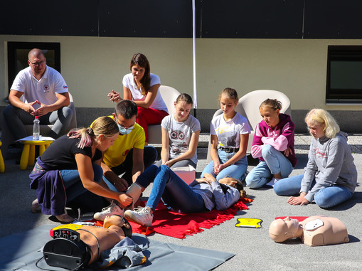 Ob tej priložnosti je Rdeči križ Slovenije, skupaj z Osnovno šolo F. S. Finžgarja iz Lesc pokazal, kako poteka izobraževanje prve pomoči na šoli.